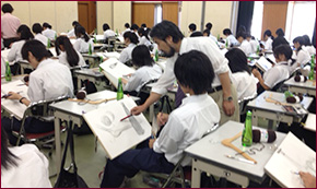 夏期集中講座全学年の生徒を対象とした、芸大進学のための実技中心の夏期講座です。7月下旬から8月上旬にかけて1週間の日程で開催し、毎年多くの生徒が参加します。また、この取組には本校教員のみならず、高大連携大学の京都精華大学や京都造形芸術大学からも先生方をお招きして、ハイレベルな実技指導を行っています。